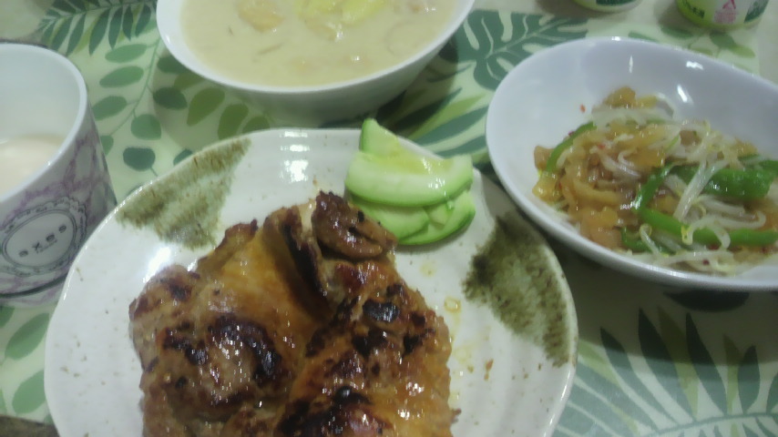 クラゲは混ぜるだけだし、トリヤキは焼き色つけたらレンジかけると焦げすぎないからイイカンジ。