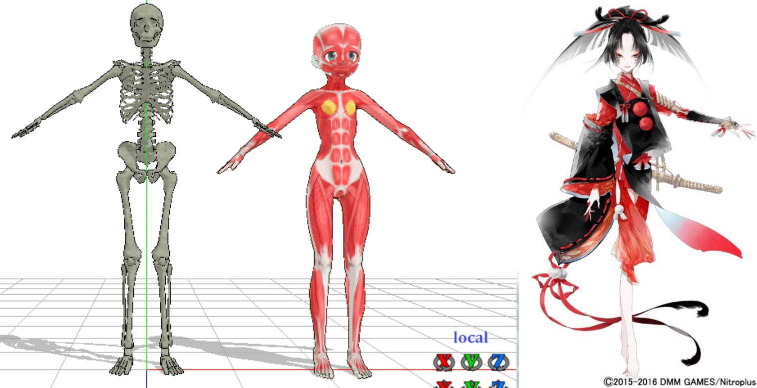 MMDモデルの骨と人体モデルで比較してみました。